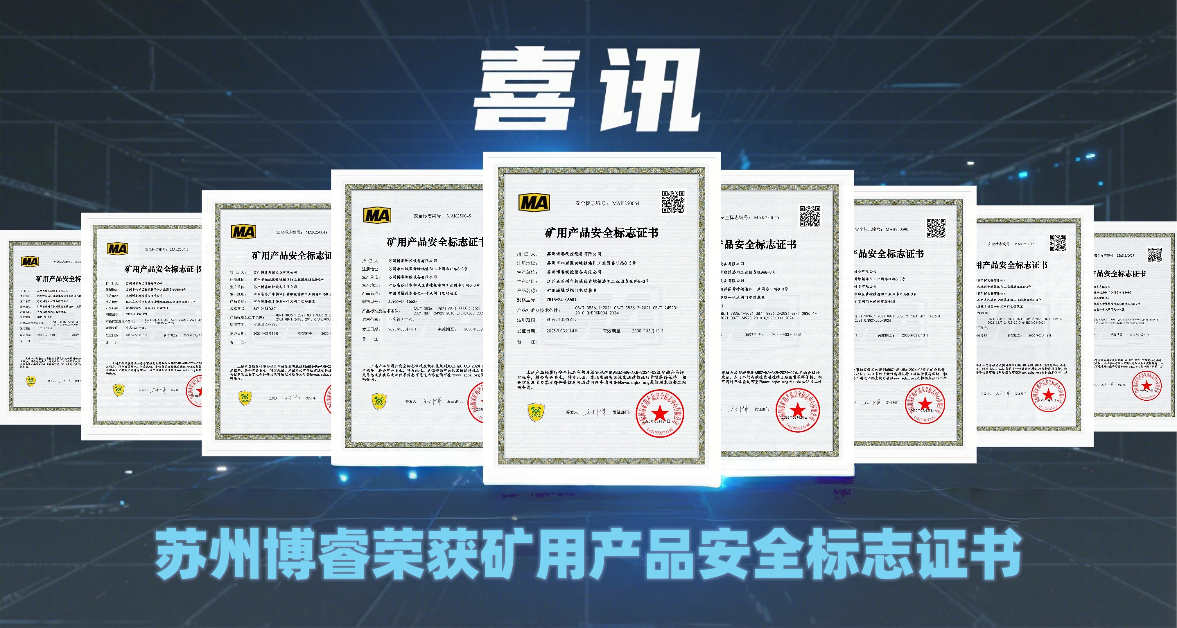 近日,蘇州博睿測控設備有限公司通過國家礦用產品安全中心的嚴格審核,成功取得礦用隔爆型閥門電動裝置安全標志證書(MA認證)。